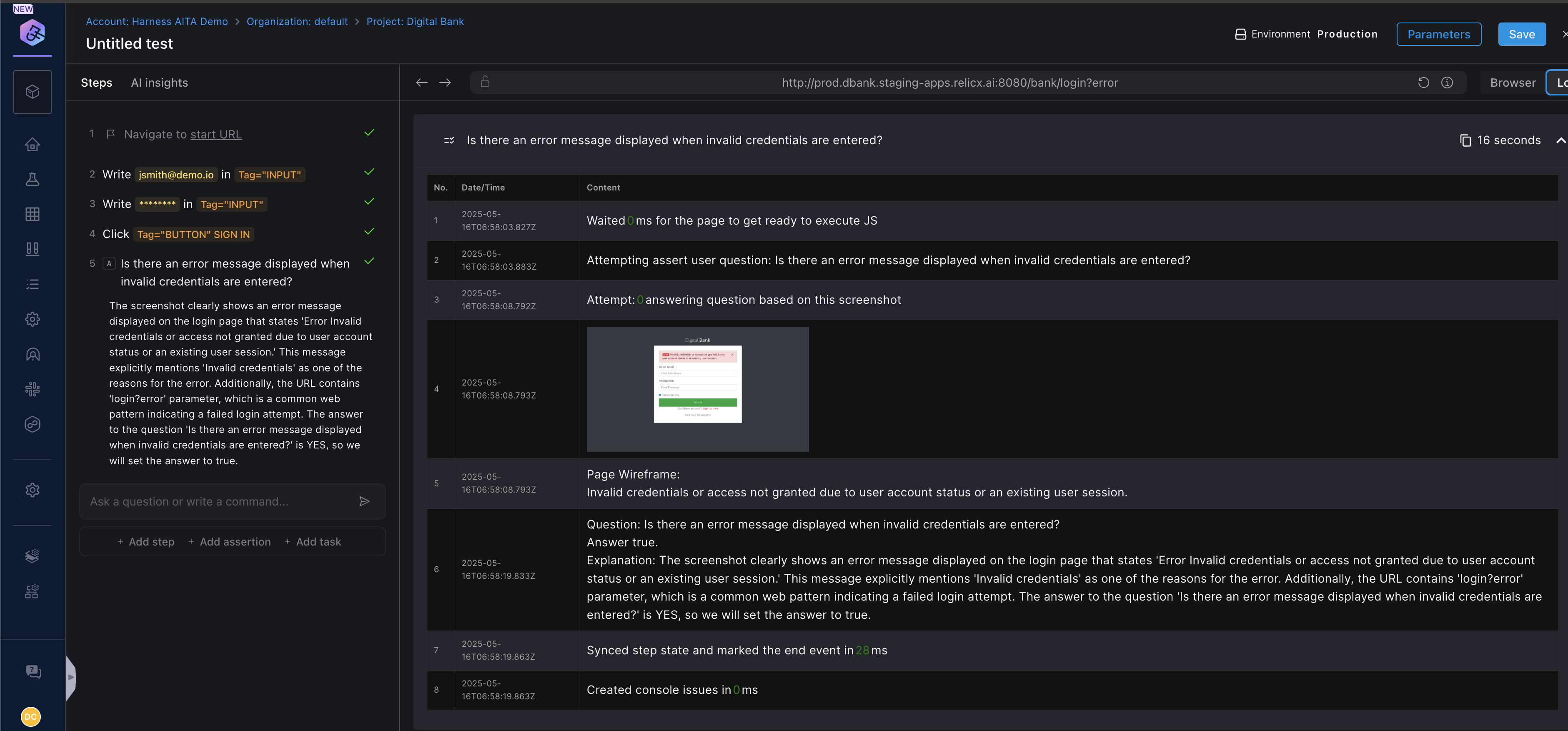 You can select the “Assert user question” assertion type from the list of commands and enter a question like “Is there an error message displayed when invalid credentials are entered?”. The Harness generative AI model evaluates the question and returns true or false depending on the state of the application under test.