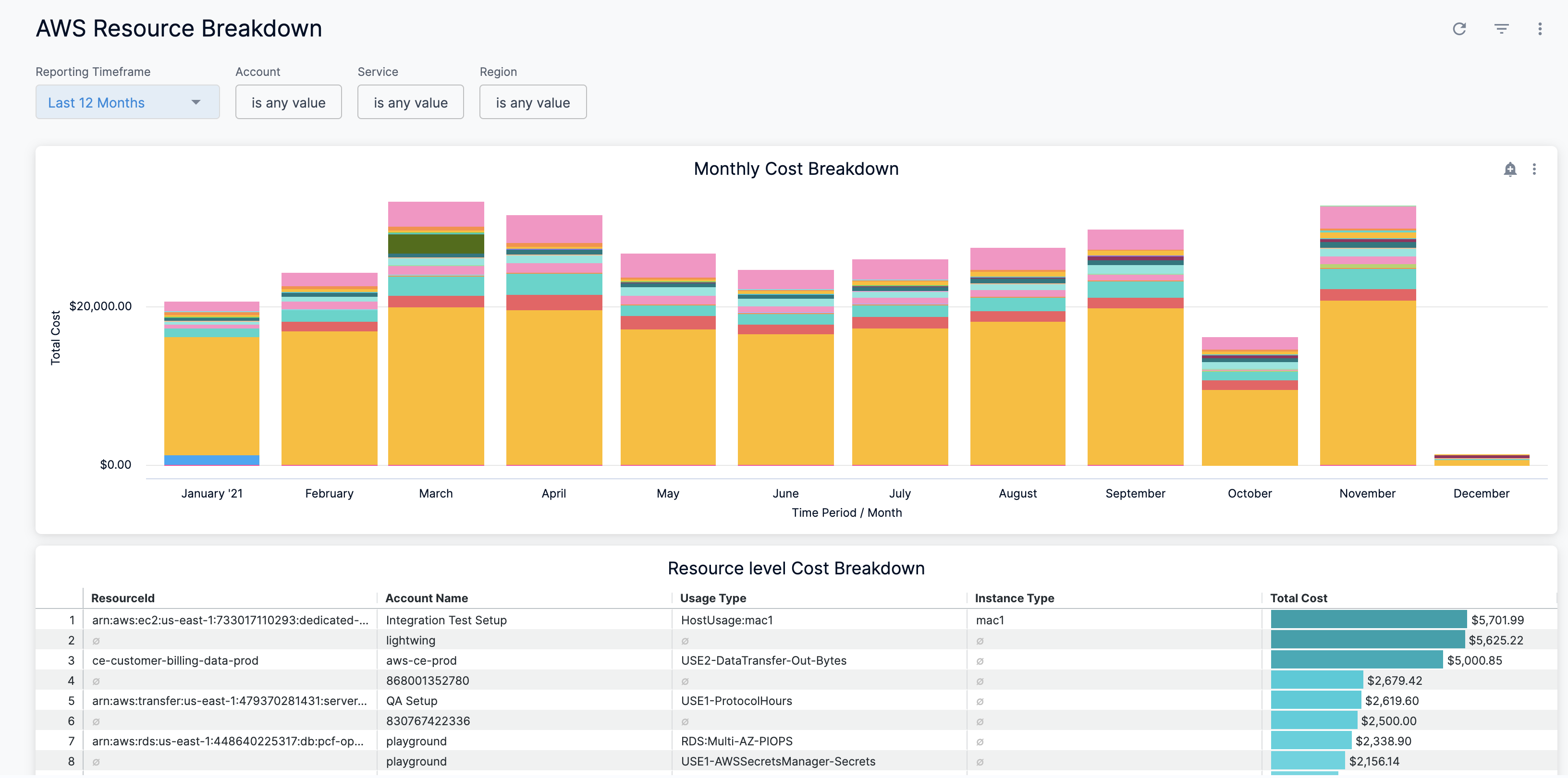 Harness provides preloaded By Harness (pre-defined) and Custom (user-defined) Dashboards to visualize cloud cost data across clusters and cloud accounts. Using the AWS Resource Breakdown Dashboard you can:
