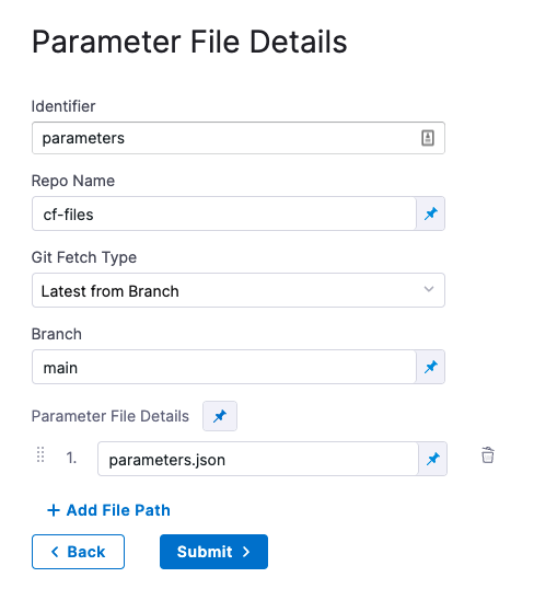 • Parameter File Details: enter the path to the file from the root of the repo. To add multiple files, click Add Path File.