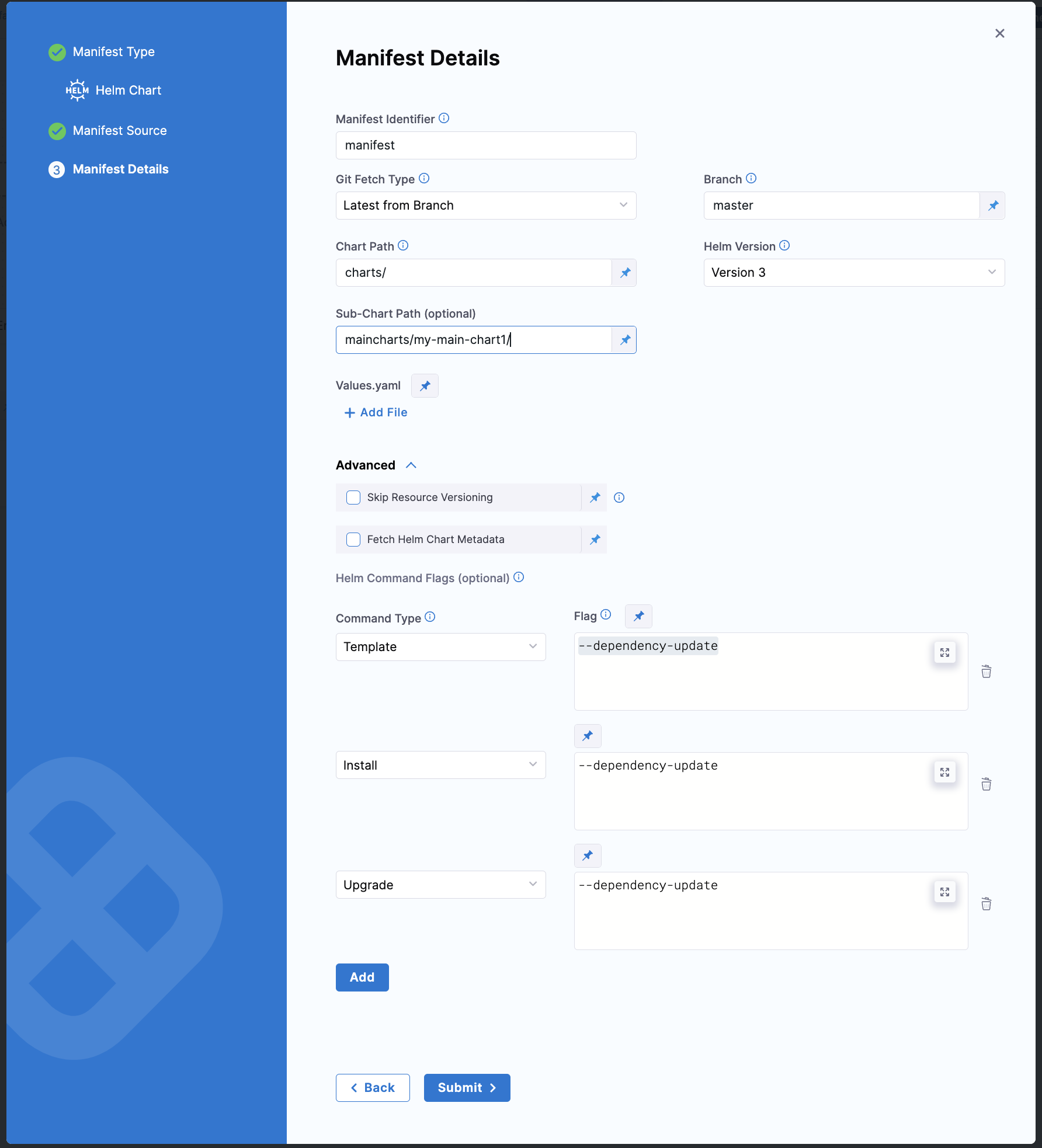 • For Kubernetes with Helm deployments (as described in this topic), configure Helm Command Flags with the Template command type and --dependency-update flag.