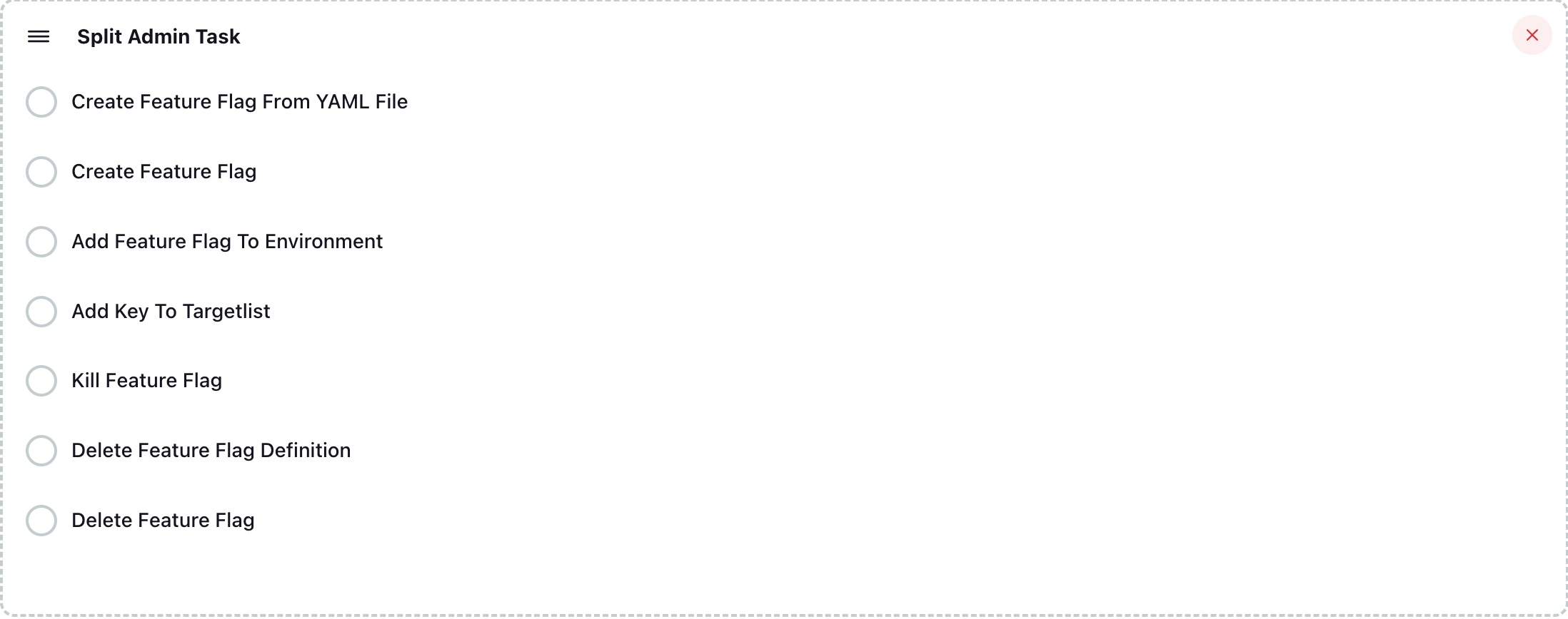 • Kill Feature Flag: This task will perform "Kill" action on a given feature flag in an environment. The fields below are required: Project Name Environment Name Split Name.