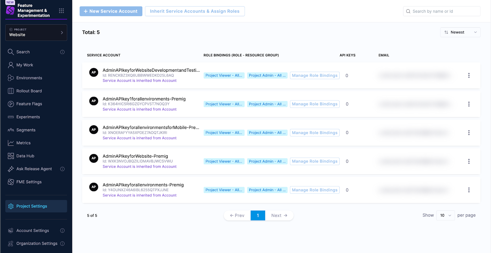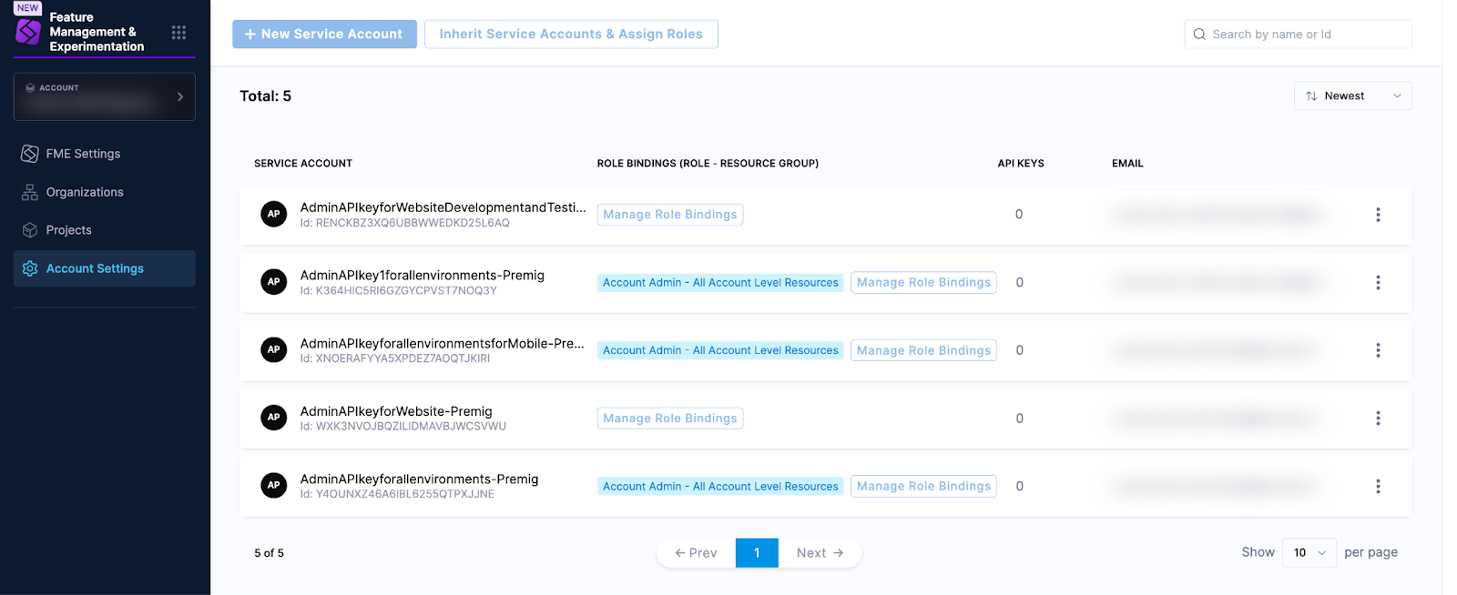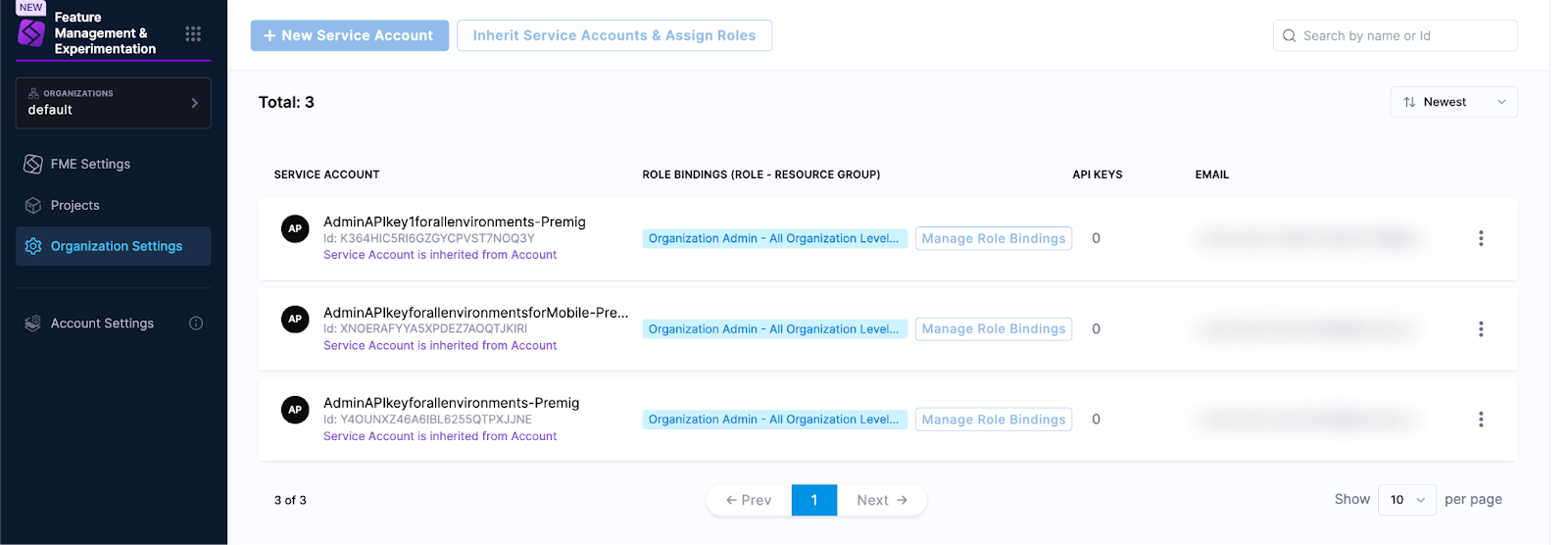 - Under the Account or Organization tab*, click on the Harness service account corresponding to the legacy Split Admin API key (the name will match the name of the legacy key, shown in FME Settings, but without spaces).