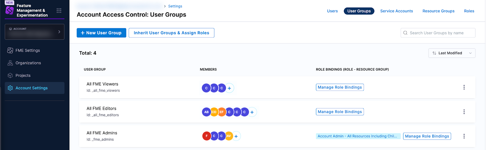 The FME user groups were created at the Harness account scope (as shown in the screenshot below), and they are inherited at the organization scope and project scope.