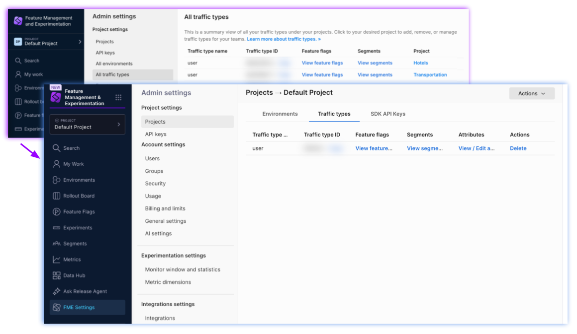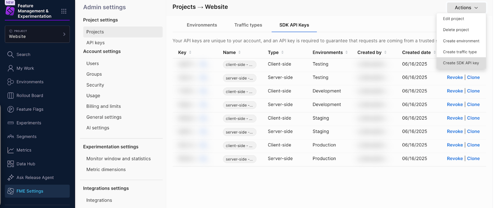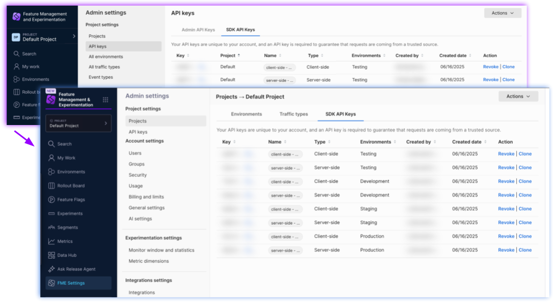 - SDK API keys: Authentication tokens used to authorize FME SDK requests. SDK API keys are managed by the Harness FME module.