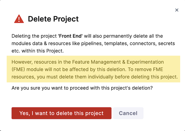 The warning in the dialog does not reflect the state of your project's FME resources. You will still see the warning "However, resources in the Feature Management & Experimentation (FME) module…" even after you have deleted all FME resources from the project.