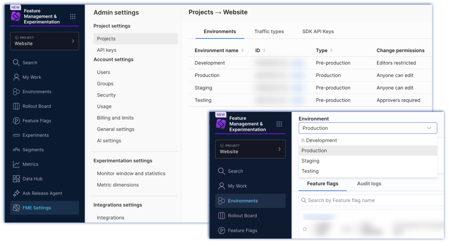 - SDK API keys - Outlines how SDK API keys (that authorize feature flag evaluations in your code) are managed in FME Settings.