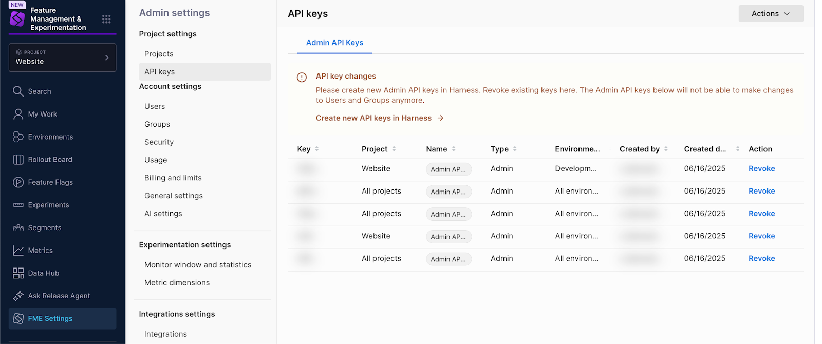 - Admin API keys - Details how to set up API keys with sufficient RBAC permissions to authorize Harness FME integrations.