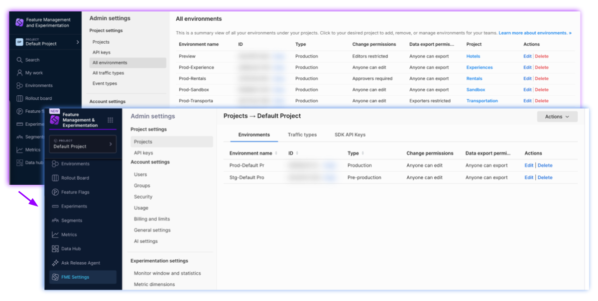 In the Feature Management & Experimentation module in Harness, FME environments are created for your project. FME environments are used to scope your FME SDK API keys, FME feature flag definitions, and FME experiments. Within the FME module, you can access a project's FME environments from the left navigation pane, by clicking Environments or by clicking FME Settings (and then clicking the View link for a project).