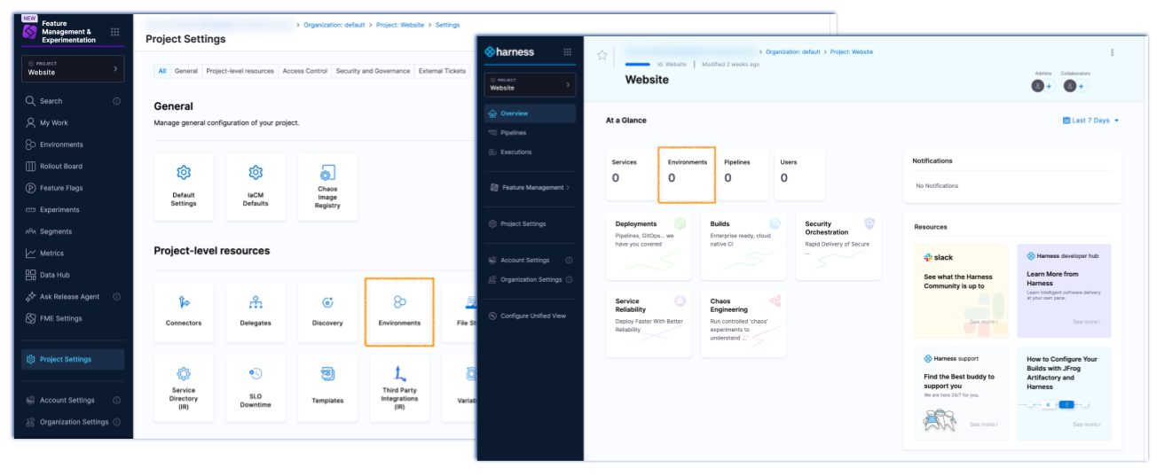 On the Harness platform you can create environments (to define infrastructure) to be used in Harness CD pipelines. These environments are shown in Harness Project Settings (shown below), Organization Settings, and Account Settings, as well as on the Harness project Overview page (shown below in Harness unified view).