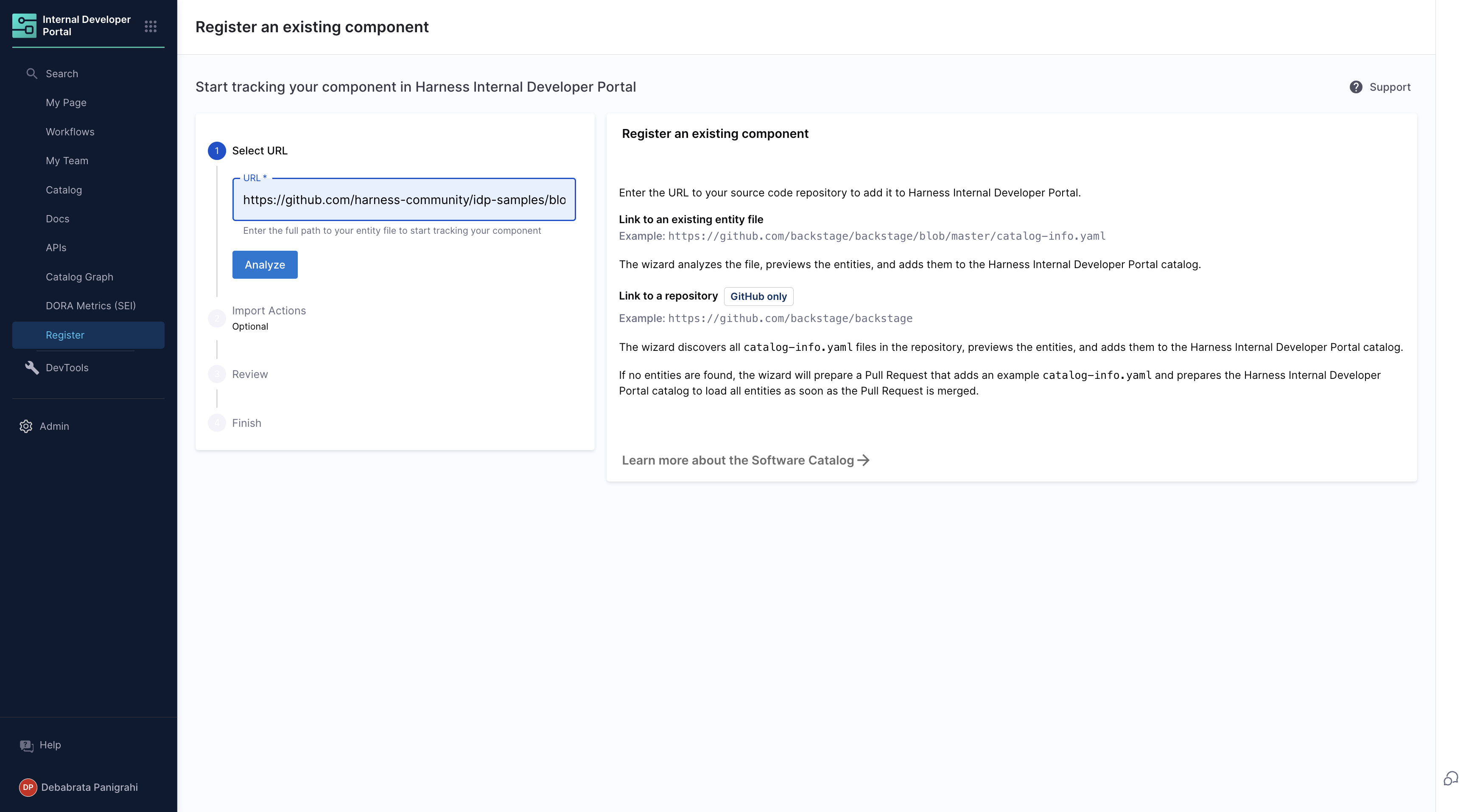 workflow.yamlfile in your source code repository. - Go to the “Workflows” page in Harness IDP and click “Register a new workflow”.