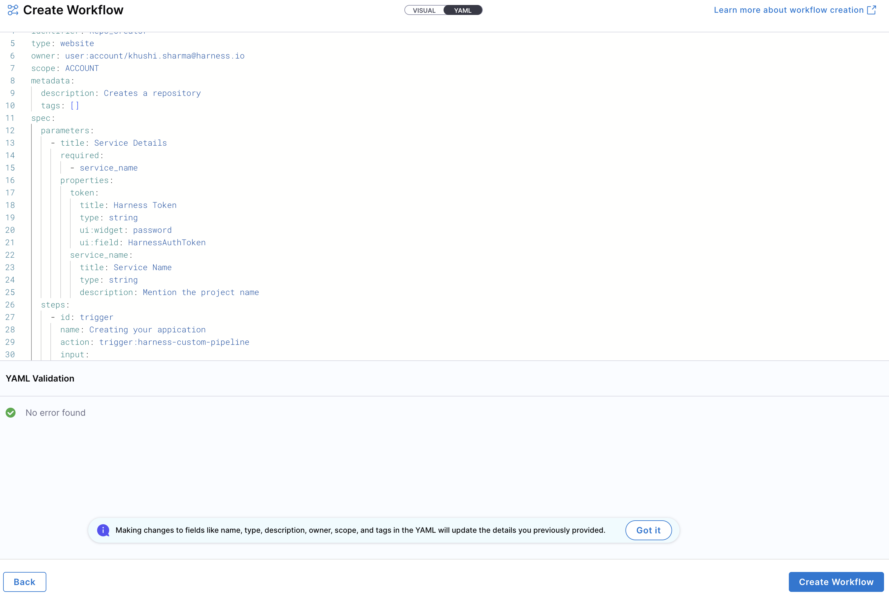 - Enter the required Workflow information. The Visual view is synced in real-time with the YAML view for full transparency.