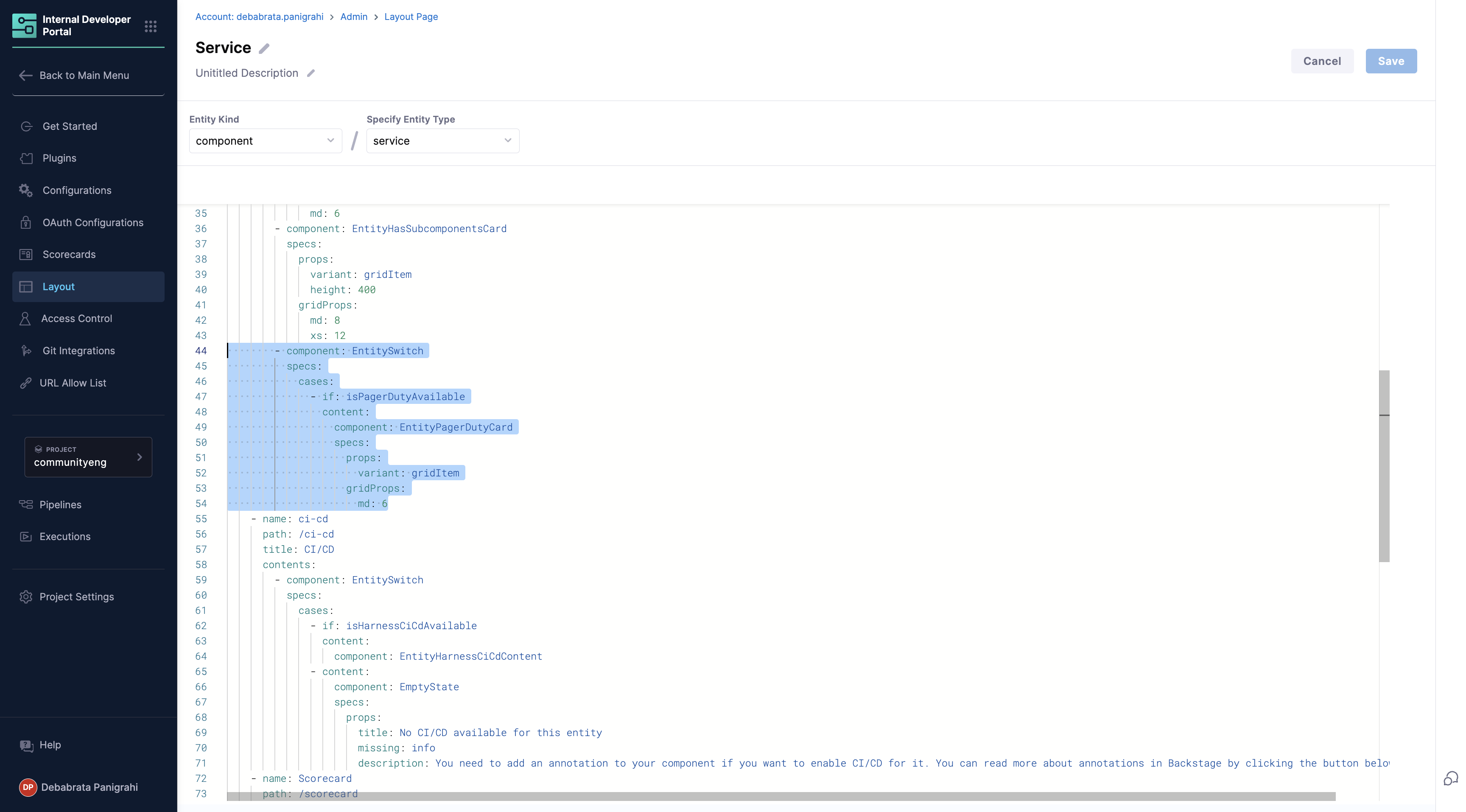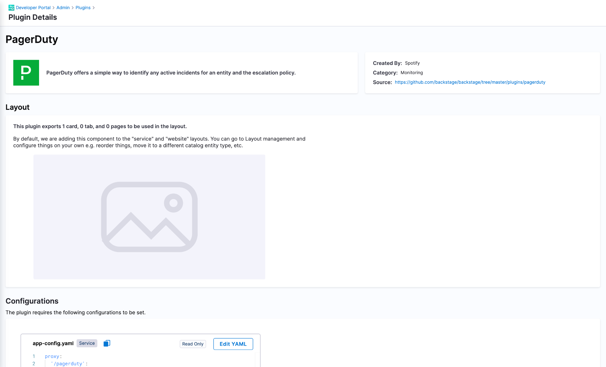 The layout management is handled by-default once you enable the plugin. In-case you want to modify the elements that are exported from the plugin according to your need you can edit the layout for Service by going to Admin -> Layout -> Catalog Entities. The elements might include cards, tabs, and pages.