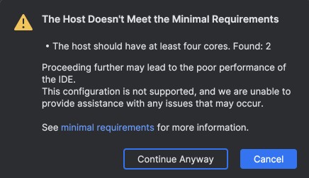 If your Gitspace does not meet the recommended requirements, the following warning may appear during your GoLand setup. You can choose to create a new Gitspace that adheres to the recommended specifications or proceed with your existing configuration.