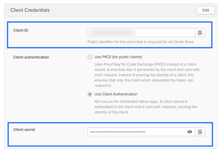 • OIDC Client ID: Public identifier for the client that is required for all OAuth flows. For example, in Okta, this is located in the Client Credentials for the app.
