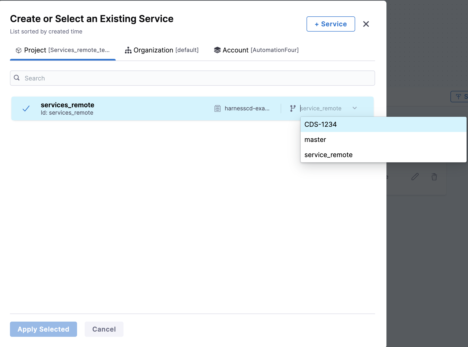 In Git Branch, select a branch. If your branch isn't listed, enter its name. Create the branch in your repository before entering it in Git Branch. Harness does not create the branch for you. Save the service to the default branch on the first save. You can then create different branches in the Harness repo if you want to create different versions of your service.