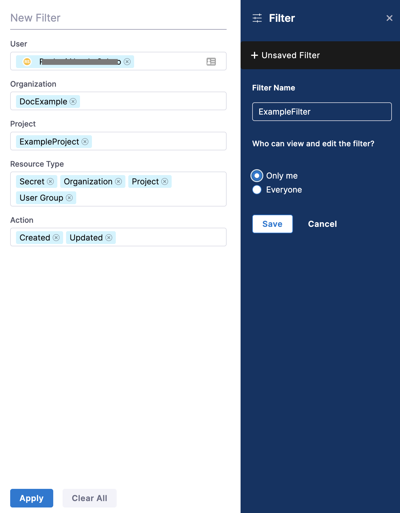 In the New Filter settings, select the filters to scope down the viewable audit events. You can scope down the viewable audit events by adding filters and selecting: