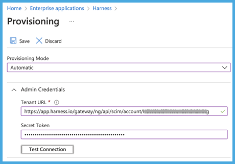 - Select Test Connection to ensure that Microsoft Entra ID can connect to Harness. If the connection fails, make sure your API key has admin permissions, and then try again.
