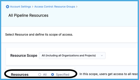 5. For Resources, select Specified, and then select Pipelines, Connectors, and any other shared resources relevant to your pipelines.