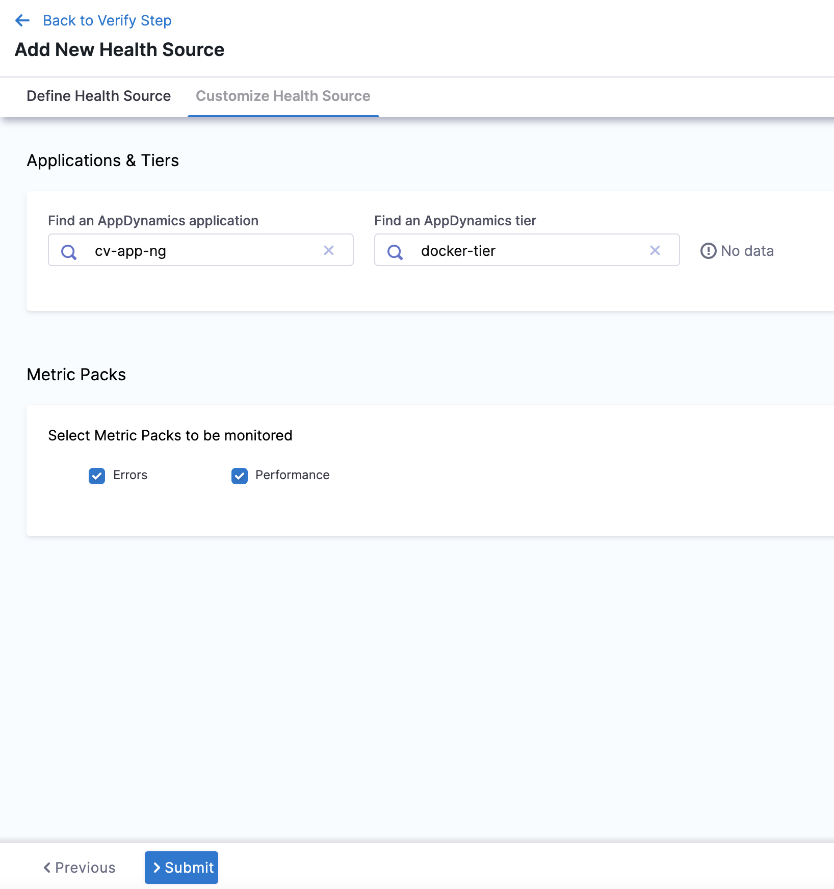 The subsequent settings in Customize Health Source depend on the Health Source Type you selected. You can customize the metrics to map the Harness Service to the monitored environment. In Applications & Tiers, enter the following details: